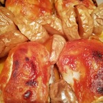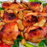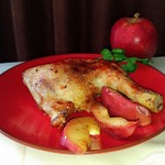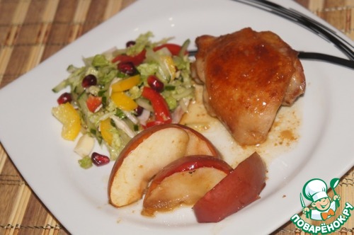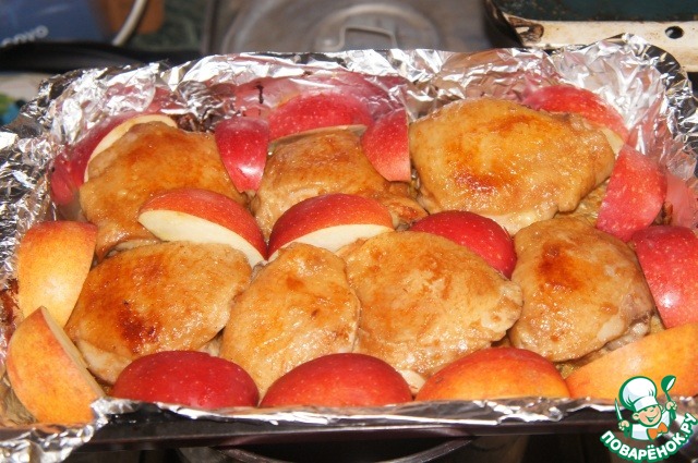 Яблоки нарезать дольками. Вынуть противень из духовки, перевернуть курицу и обложить дольками яблок. |