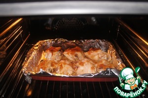 Курицу (я взяла бедра) посолить, смазать снаружи и внутри соусом (если это куски курицы, то залить соусом) и 2-3 часа мариновать в прохладном месте. Затем выложить на противень, застеленный фольгой, кожей (или спинкой) вниз и поставить в горячую духовку.