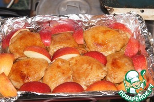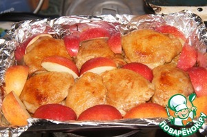 Вынуть противень из духовки, перевернуть курицу и обложить дольками яблок. -
