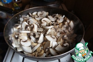 Грибы нарезать пластинками и обжарить в масле, пока не выпарится жидкость. Посолить и поперчить.