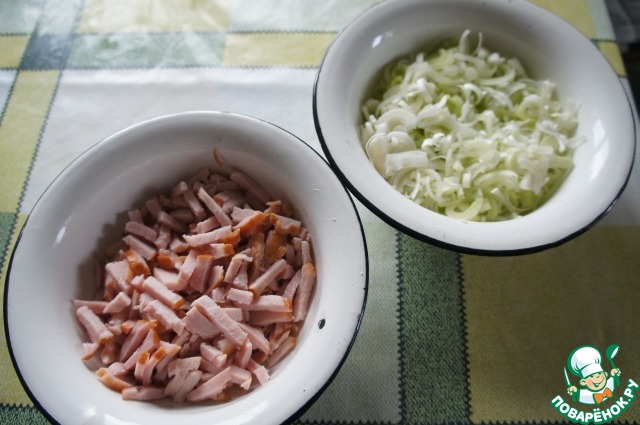Порей нарезать колечками и промыть холодной водой, дать ей хорошо стечь. Мясо нарезать соломкой.