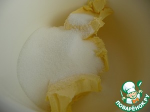 Сливочное масло (маргарин) взбить с сахаром и ванильным сахаром.