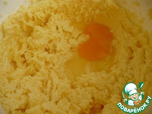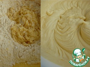 Муку смешать с разрыхлителем, добавить в масляно-яичную смесь, взбить.