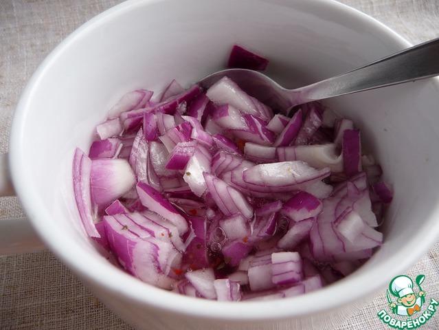 Лук замариновать в рассоле от огурцов (2-3 ст. л.) на 20 мин.