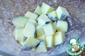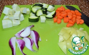 Нарезать баклажан кубиками и, засыпав солью, перемешать и отставить. Морковь, кабачок, цуккини, лук, перец нарезать примерно одинаковыми кусочками, но не мелко.