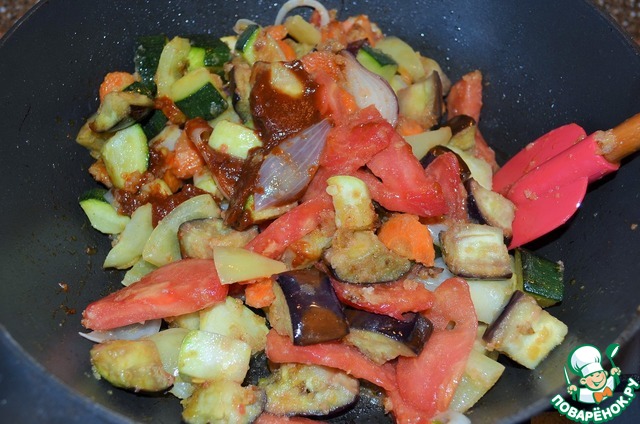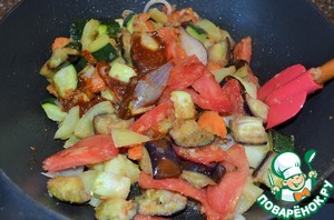 Продолжить обжаривание в сотейнике, общей массой. Добавить томатную пасту и резанный помидор. Помидор не поленитесь почистить от кожицы. Жарить на среднем огне 5 минут, перемешивая. Влить 1 стакан кипятка, тушить еще 10 минут.