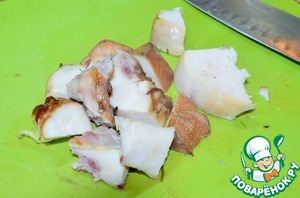 Копченую куриную грудку нарезать на аналогичные куски. Не принципиально брать куриную грудку, другие части курицы тоже подойдут.