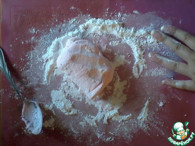 После этого добавляем крахмал и сахарную пудру (1:2) (т. е 1 сталовая л. крахмала и 2 ст. л сахарной пудры) и начинаем вымешивать эту сладкую массу =)