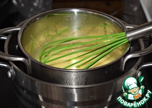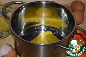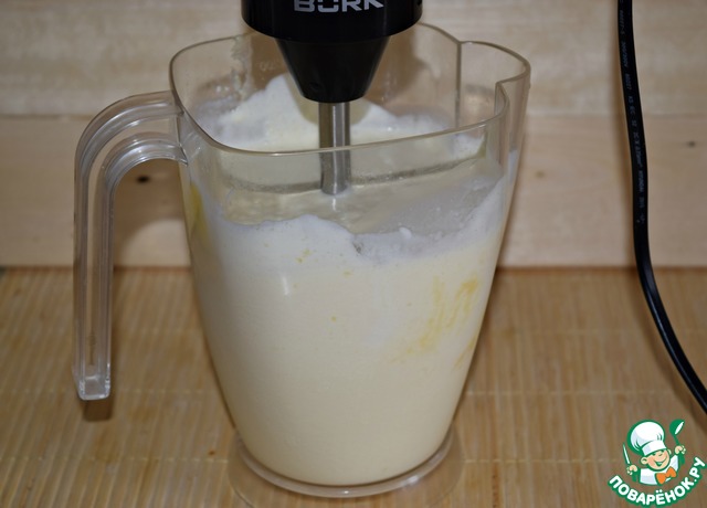 Взбить желтки с сахарной пудрой в отдельной посуде, стоящей на паровой бане, в течение 5-6 минут до загустения. Взбивать непрерывно, чтоб избежать образования комочков.