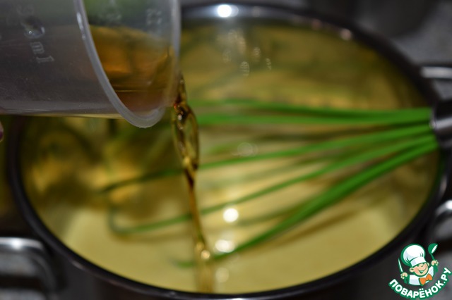 Снять посуду с огня и добавить в получившийся крем ликёр и взбивать ещё пару минут. (если предполагается, что десерт будут есть дети, то этот шаг пропускаем) Остудить крем до комнатной температуры.