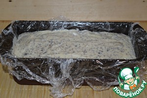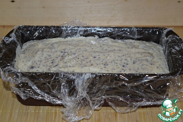 Выстелить пищевой плёнкой форму. (у меня форма для кекса размером 20*10*6) Выложить смесь в форму, накрыть её пищевой плёнкой и поставить в морозильную камеру на 6-8 часов. (можно на ночь)