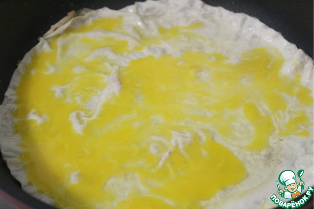 Разбиваем яйцо на лаваш и ложкой распределяем по всей поверхности.