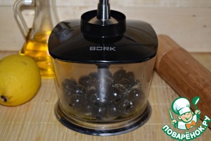 Приготовим оливковую пасту. Измельчить оливки в блендере. (до состояния однородного пюре измельчать не стоит, вкуснее, когда в пасте есть отдельные кусочки маслин)