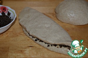 Разделить тесто на две части и каждую раскатать в пласт толщиной 1-1,5 см.