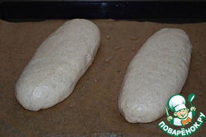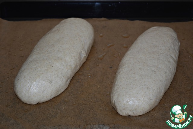Таким же образом поступить со второй частью теста. Выложить батоны на противень, застеленный бумагой для выпечки, швом вниз. Накрыть полотенцем и поставить для подхода в тёплое место на час. (я ставлю в духовку при режиме СВЕТ)