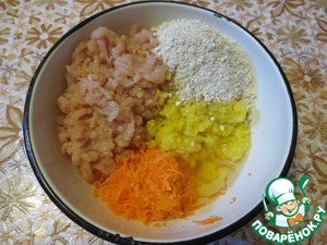 Собрать все ингридиенты в одной миске (куриная грудка, кабачок, морковь, белок, овсяная мука). -