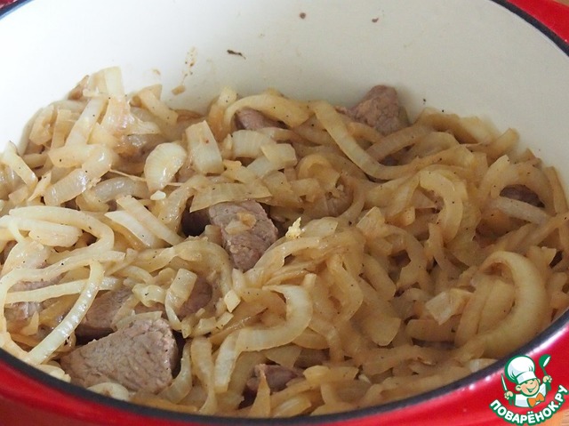 Приготовить кастрюлю с толстым дном, диаметром 23-25 см. На дно выложить половину мяса, посолить его и поперчить. На мясо выложить половину лука. Также поступить с остальным мясом и луком.