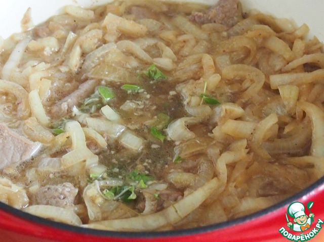 Говяжий бульон (можно использовать бульонный кубик), налить в сковороду, где обжаривалось мясо и лук, нагреть его, соскребая со стенок остатки сока. Бульон вылить в кастрюлю с мясом. Добавить столько пива, чтобы мясо было полностью покрыто. Мне хватило одной бутылки, у кого кастрюля пошире, может понадобиться еще немного пива. Добавить коричневый сахар, он замаскирует горьковатый привкус пива. Кастрюлю накрыть крышкой, поставить в разогретую духовку. У Джулии указано время приготовления два с половиной часа, но мне хватило 1 часа 40 минут. Смотрите по своей духовке, жидкость должна все время потихонечку кипеть, поэтому подрегулируйте температуру.
