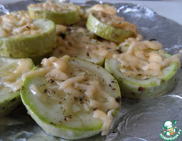 Противень или форму застелить пергаментом или фольгой, выложить кабачковые кружочки, отправить форму в духовку, предварительно разогретую до 180 С. Запекать около 10 минут на средней полке духовки.