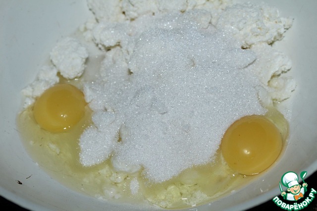 • К творогу добавить яйца и 0,5 стакана сахара, хорошенько перемешать, чтобы было меньше крупных комков.