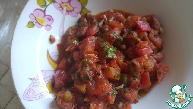 Соус: нарезать помидоры кубиками и высыпать на разогретую сковороду с оливковым маслом, добавить резаный чеснок, зеленый лук, петрушку, соль и специи, поджаривать минут 10-15. -