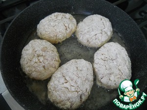 Затем берем муку припудриваем обильно руку, сверху кладем фарш, снова припудриваем обильно мукой и формируем наши ленивые голубцы (с усилием) в виде котлеты. И отправляем обжариваться на растительном масле.