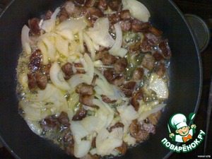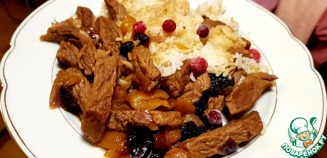 Топим половину сливочного масла, и хорошенько обжариваем мясо, до золотистой корочки, добавляем лук, нарезанный тонкими полукольцами, жарим тоже до золотистого цвета, теперь добавляем 4 стакана кипяченой воды, тушим на среднем огне 15-20 минут, или просто попробуйте мясо, добавляем промытые и сухофрукты и половину изюма, тушим 15 мин.