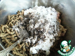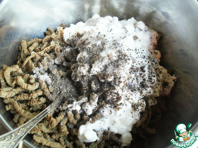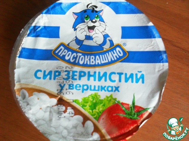 Добавить творог. У меня был зернистый в сливках. Можно использовать любой, только не сухой.