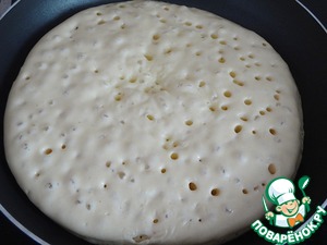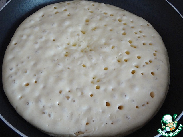 Влейте тесто и готовьте на среднем огне минут пять до неполной готовности: сверху лепешка должна остаться немного влажной. -