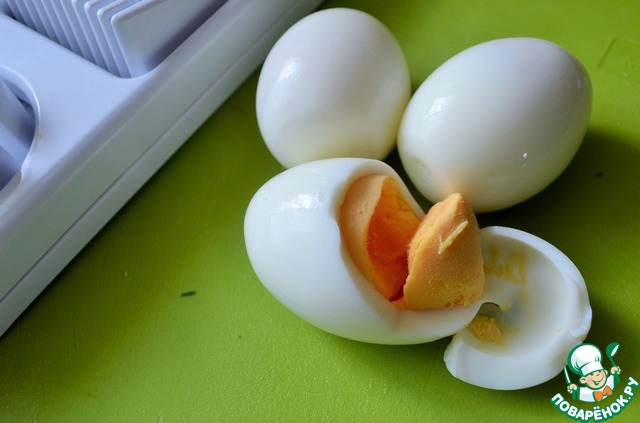 Измельчить яйца на яйцерезке или вручную, предварительно отложив один желток.