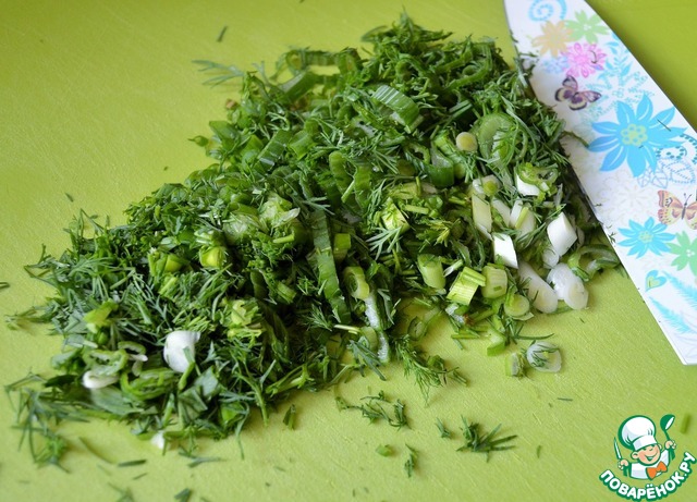 Продолжаем готовить окрошку. Нарезать зеленый лук и укроп.