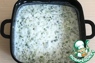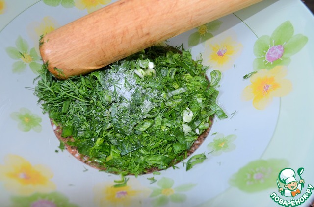 • В емкости, в которой будем смешивать и подавать окрошку, истолочь зелень с солью.