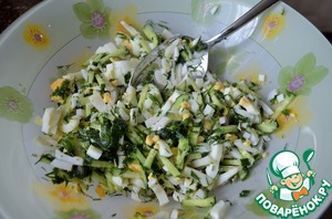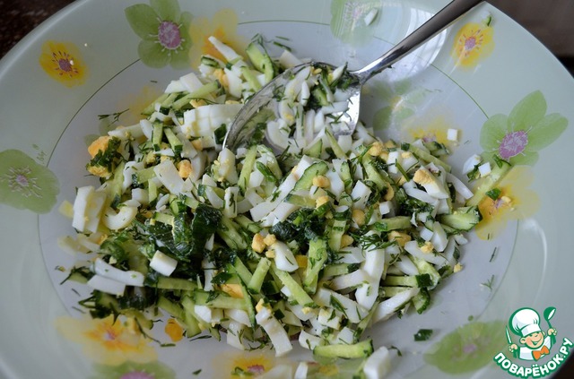 • Выложить в миску огурцы, кальмары, яйца, перемешать.