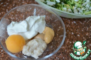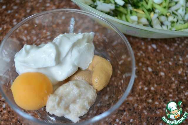 Соединить горчицу, хрен, желток вареного яйца и сметану.