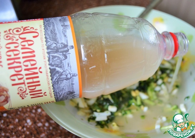 • Влить охлажденный квас, я использую белый традиционный квас "Семейный секрет" от ТМ Очаково.