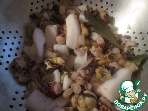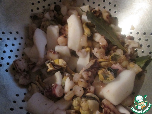 Морской коктейль отварить в кипящей воде в течении 5 минут с момента закипания с добавлением душистого перца и лаврового листа. Откинуть на дуршлаг.