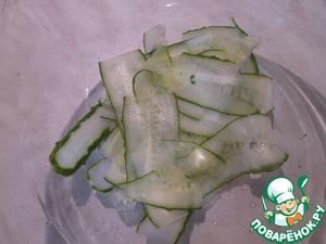 Огурцы нарезать тонкими пластинами специальным ножом или овощечисткой.