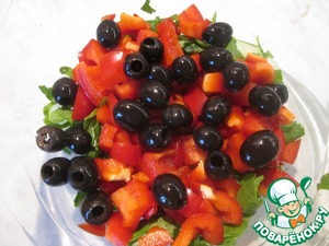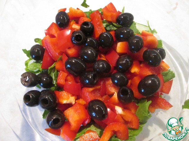 Рукколу порвать руками, болгарский перец порезать кубиками. Добавить маслины ( целиком )