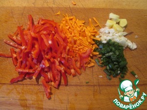 Чеснок измельчить, имбирь крупно порезать, морковь и перец порезать тонкой соломкой, порезать лук.
