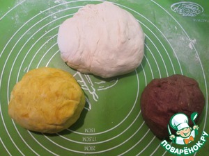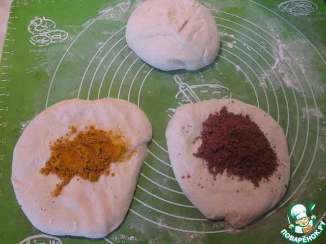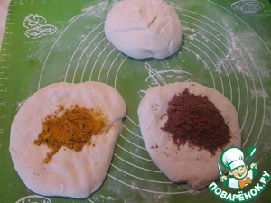 Выложить тесто на рабочую поверхность и разделить его на три равные части. Из двух частей сделать небольшие лепешки и положить на одну из них какао, а на другую - куркуму.
