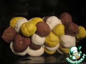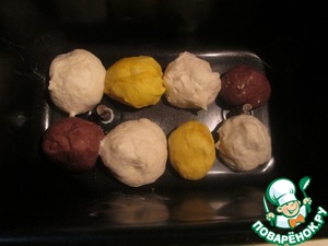 Теперь самое интересное - формовка хлеба. Можно цветные части разделить, раскатать в жгутики и выложить вдоль длинного края ведерка ХП, чередуя цвета. Можно сплести разноцветную косичку. Я формировала небольшие шарики и укладывала их в ведерко на некотором расстоянии друг от друга. Это первый ряд.