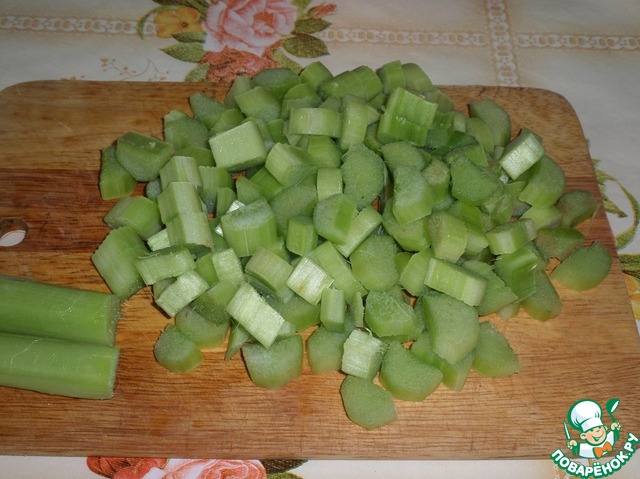 Промываем водой стебли ревеня, очищаем от грубых волокон. Нарезаем ревень кусочками толщиной 1-1,5 см.
