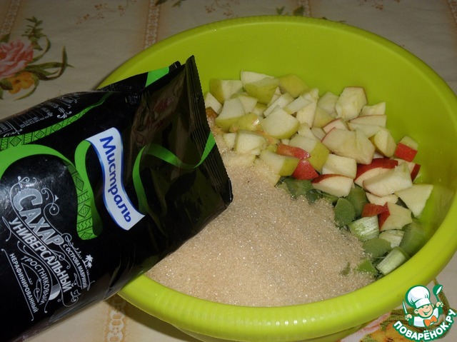Выкладываем нарезанные ревень и яблоки в глубокую чашку. Добавляем необходимое количество сахара. Я использовала тростниковый сахар "Универсальный" ТМ "Мистраль".