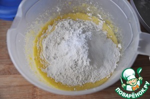 Добавляем просеянную муку и разрыхлитель. Взбиваем миксером.
