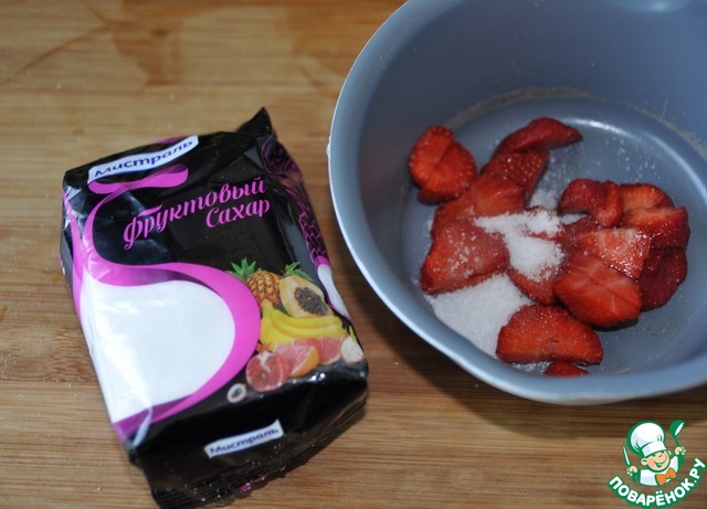 Клубнику режем и засыпаем фруктовым сахаром от "Мистраль".