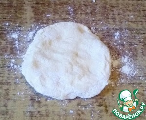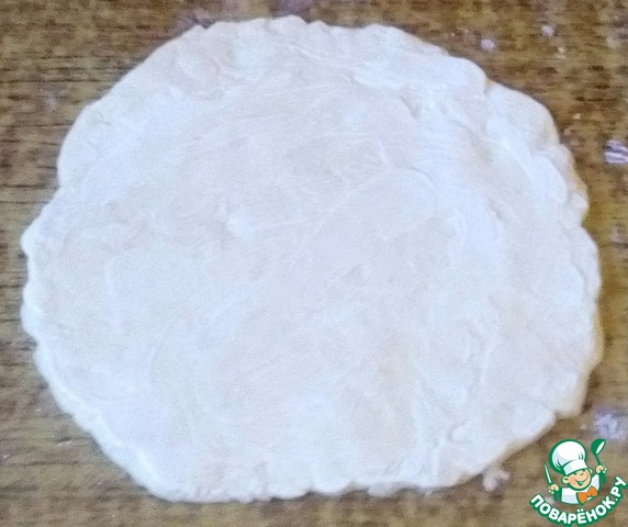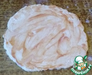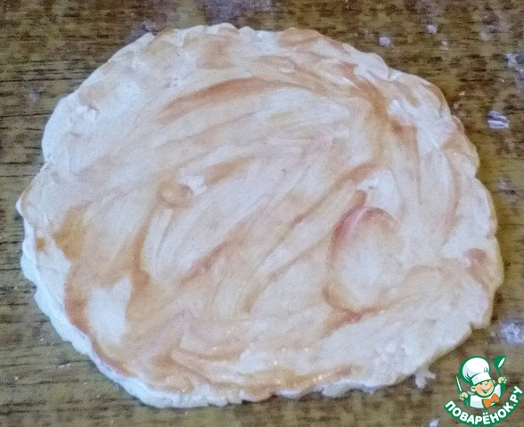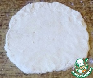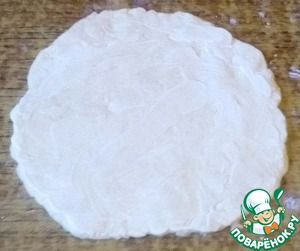 Готовое, немного охлаждённое, тесто раскатать на припылённом мукой столе в круг по размеру мультиварки (у меня диаметр 21 см). Толщина теста должна быть примерно 0,5 см. -