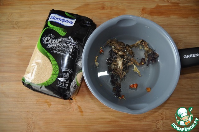 Готовим маринад. В сотейнике смешиваем соль, сухой базилик, перец чили, уксус, воду, добавляем универсальный коричневый сахар от "Мистраль".
