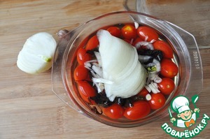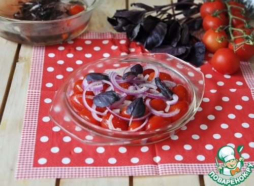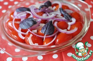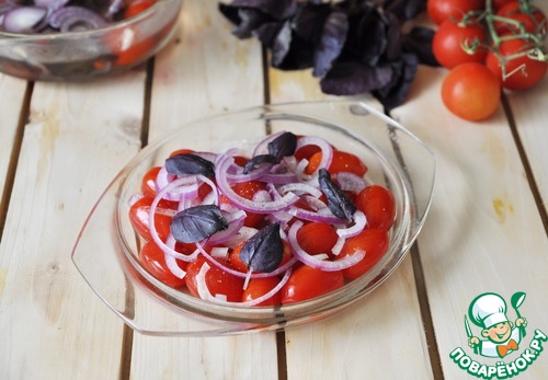 Помидорки достаём из маринада, поливаем оливковым маслом, посыпаем красным луком, базиликом, смесью перцев.