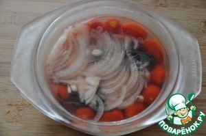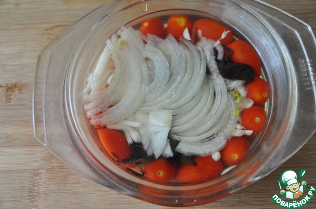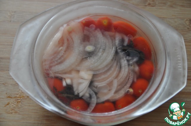 Кладём помидоры в удобную кастрюльку (у меня для СВЧ печи), заливаем слегка остывшим маринадом.