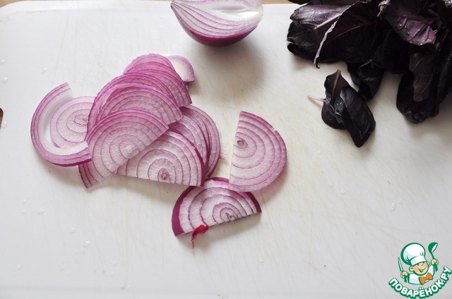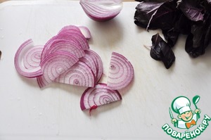 Режем полукольцами красный лук, у базилика обрываем листики.